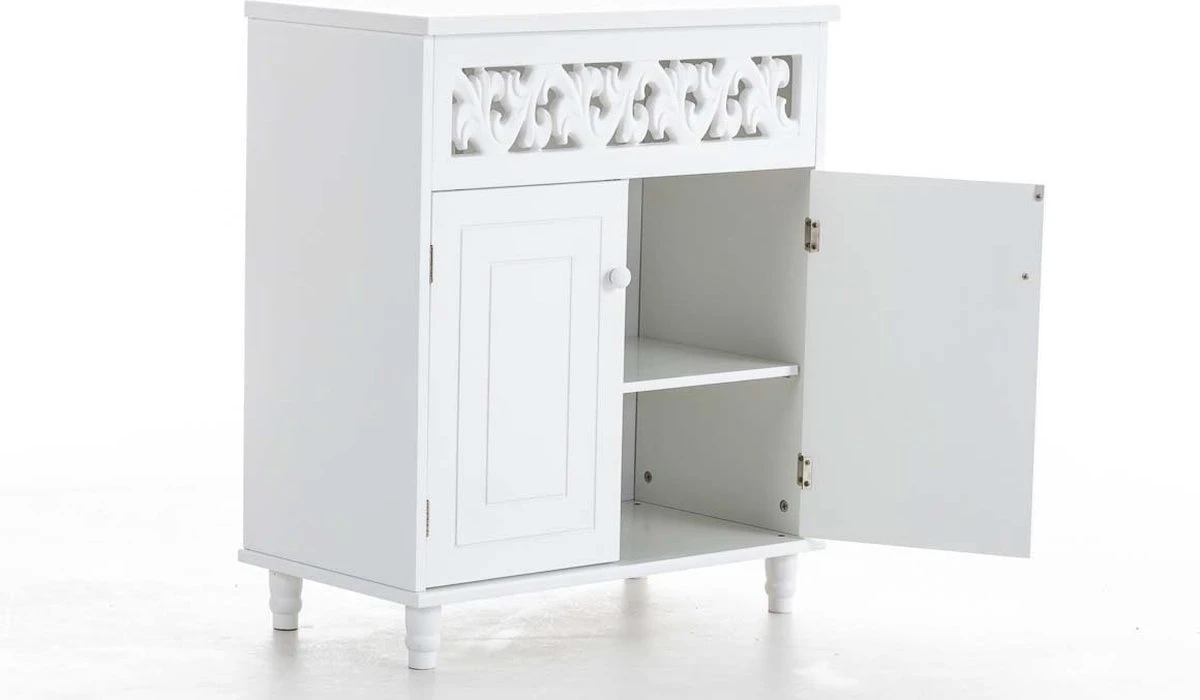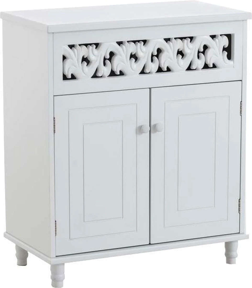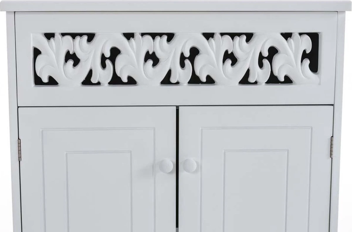 Deze romantische ladekast in vintage-stijl is een origineel en uniek meubelstuk dankzij de stucco-achtige decoratieve houten decoratie. Massieve houten poten garanderen absolute stabiliteit. De geïntegreerde plank aan de binnenkant biedt ook optimale opslagruimte op twee niveaus voor de opslag van uw persoonlijke bezittingen. Subtiele deurknoppen versieren bovendien de deuren en zorgen voor gemakkelijk openen en sluiten.