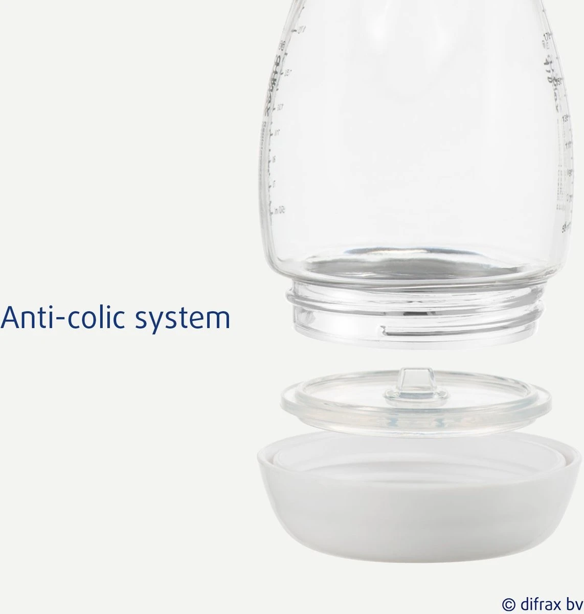 In de bodem van de handgreepfles zit een uniek Anti-colic ventiel. Dit voorkomt vacuüm zuigen en vermindert de kans op boeren, spugen en darmkrampjes. De flessenspeen heeft een zachte afwerking. Door de afschroefbare bodem is de babyfles makkelijk schoon te maken. Ontwikkeld door Difrax medisch team.
