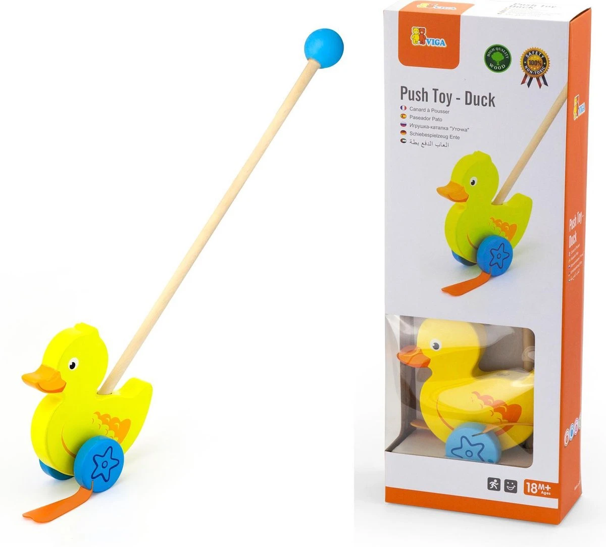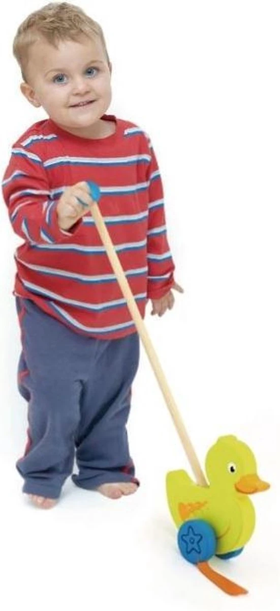 Duw of trek zachtjes aan deze mooie duwstok. Kleine voetjes komen in beweging om samen te lopen met deze leuke eend. De voeten van de eend klapperen vrolijk mee. Hoogte van de duwstok is 51 centimeter. Aanbevolen leeftijd is twee jaar en ouder.