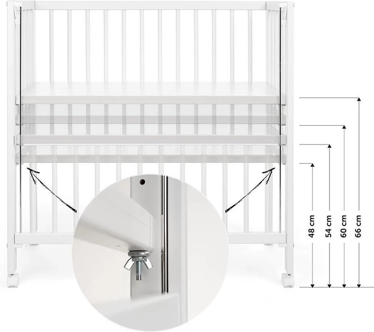 - Past op standaard bedden en boxspring bedden – De bedbodem kan op 5 verschillende hoogtes worden ingesteld. Het past aan het matras van elk ouderlijk bed met een hoogte van 54 tot 70 cm. Het aanschuifwiegje kan aan het bed worden bevestigd met de bijgeleverde band.