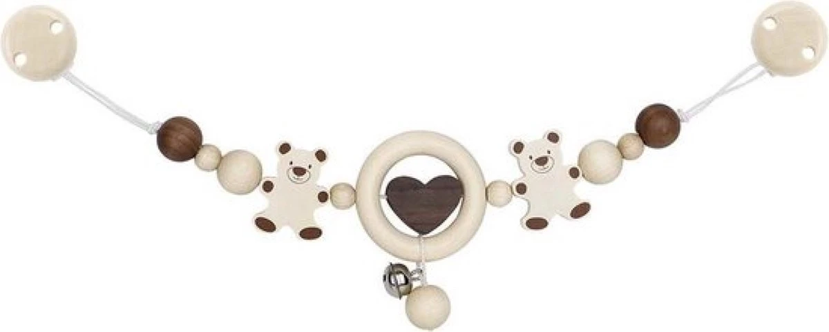 Deze mooie naturel houten wagenspanner met beertjes heeft een lengte van 40 cm en is voorzien van 2 roestvrij stalen clips. Eenvoudig te bevestigen en zeer degelijk. Kinderen zullen er naar kijken en grijpen en het belletje laten rinkelen. Voor plezier en afleiding onderweg.