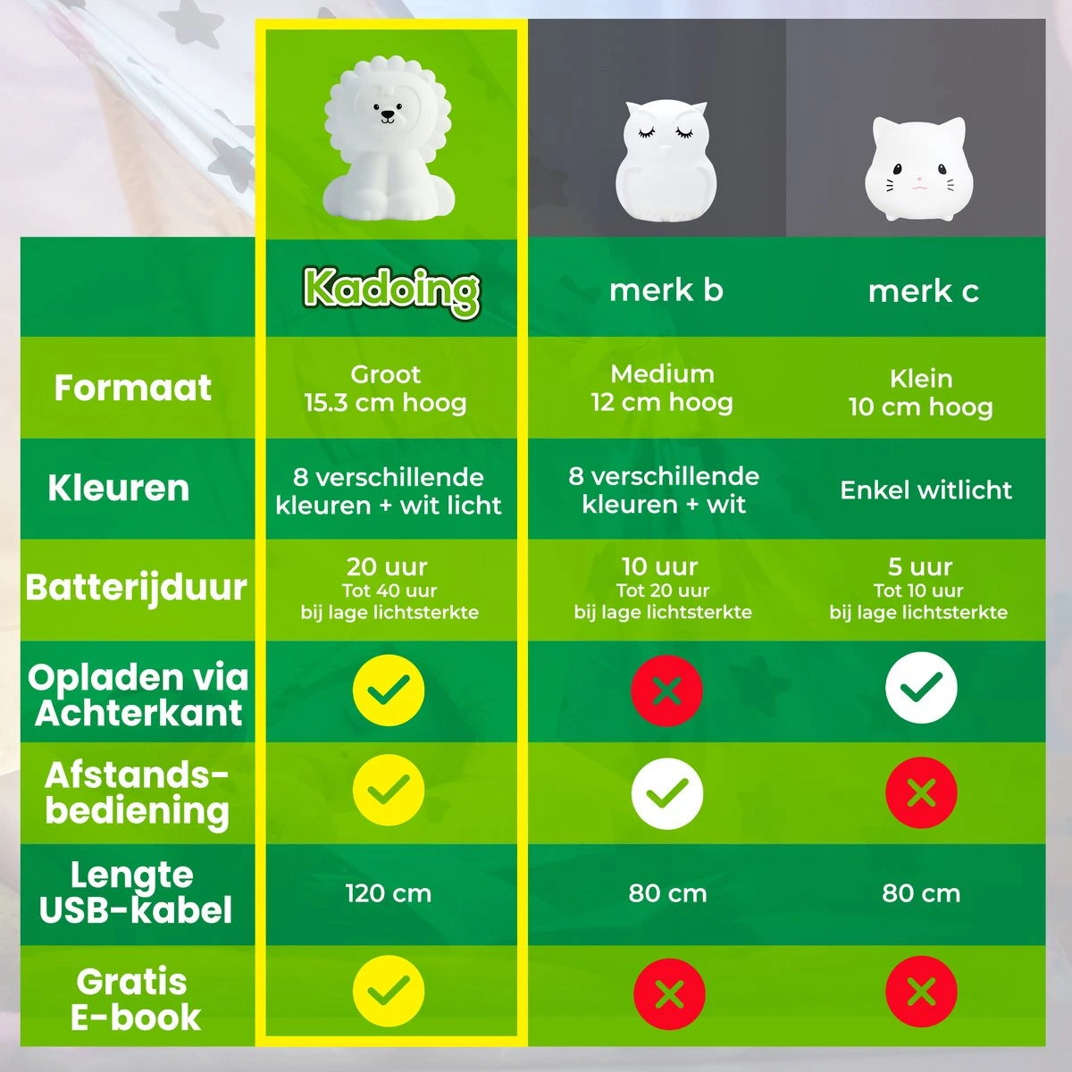 Een goede nachtrust is belangrijk voor een gezonde ontwikkeling bij kinderen. Toch kan alleen slapen in het donker voor onrustige nachten zorgen – zowel voor kind als voor ouder. Daar hebben we bij Kadoing wat op gevonden: maak kennis met de Leeuw nachtlamp. Het Leeuw nachtlampje jaagt monsters en spoken weg, is van kindvriendelijk materiaal én is het ideale slaapmaatje voor in bed. Zodat kinderen de rust krijgen die essentieel is voor een gezonde ontwikkeling en zodat ouders ‘s avonds met een gerust hart in bed kunnen stappen.