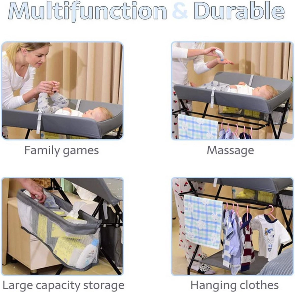 - Opvouwen met één klik, meerdere ruimtes, het is veilig en stabiel (stabiel frame met driehoekig frame van versterkt staal, de onderste laag geplaatste items dragen 20 kg, de hele verzorgingstafel kan 50 kg dragen).