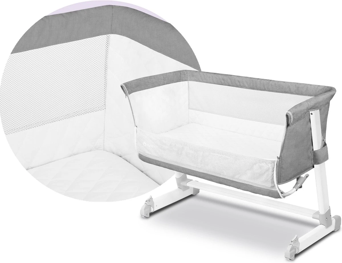Het Theo co-sleeper is voorzien van een uiterst comfortabele matras met een afmeting van 50 x 87 cm en een dikte van 4 cm. Het structuur op basis van 3 speciale lagen biedt uitzonderlijk comfort voor de slapende baby:Miękkie poszycie pokrowca
