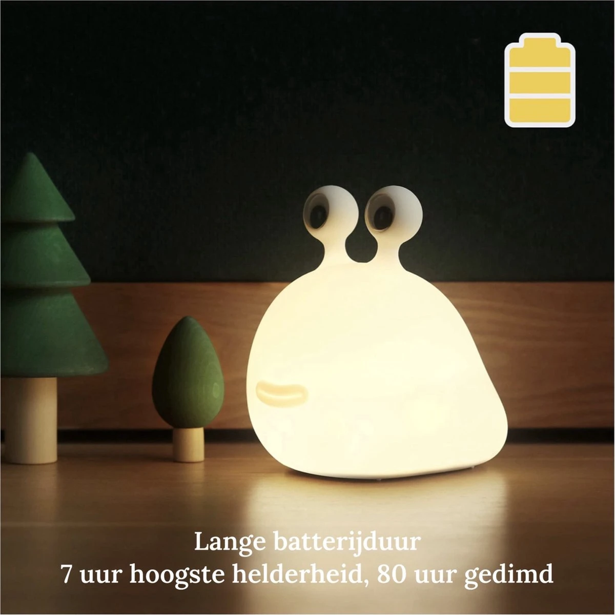 Het oplaadbare led-nachtlampje met ingebouwde 1800 mah-batterij kan 100 uur in de donkerste nachtmodus blijven branden of 6 uur in de helderste instelling; de led-indicator knippert rood als de batterij bijna leeg is.