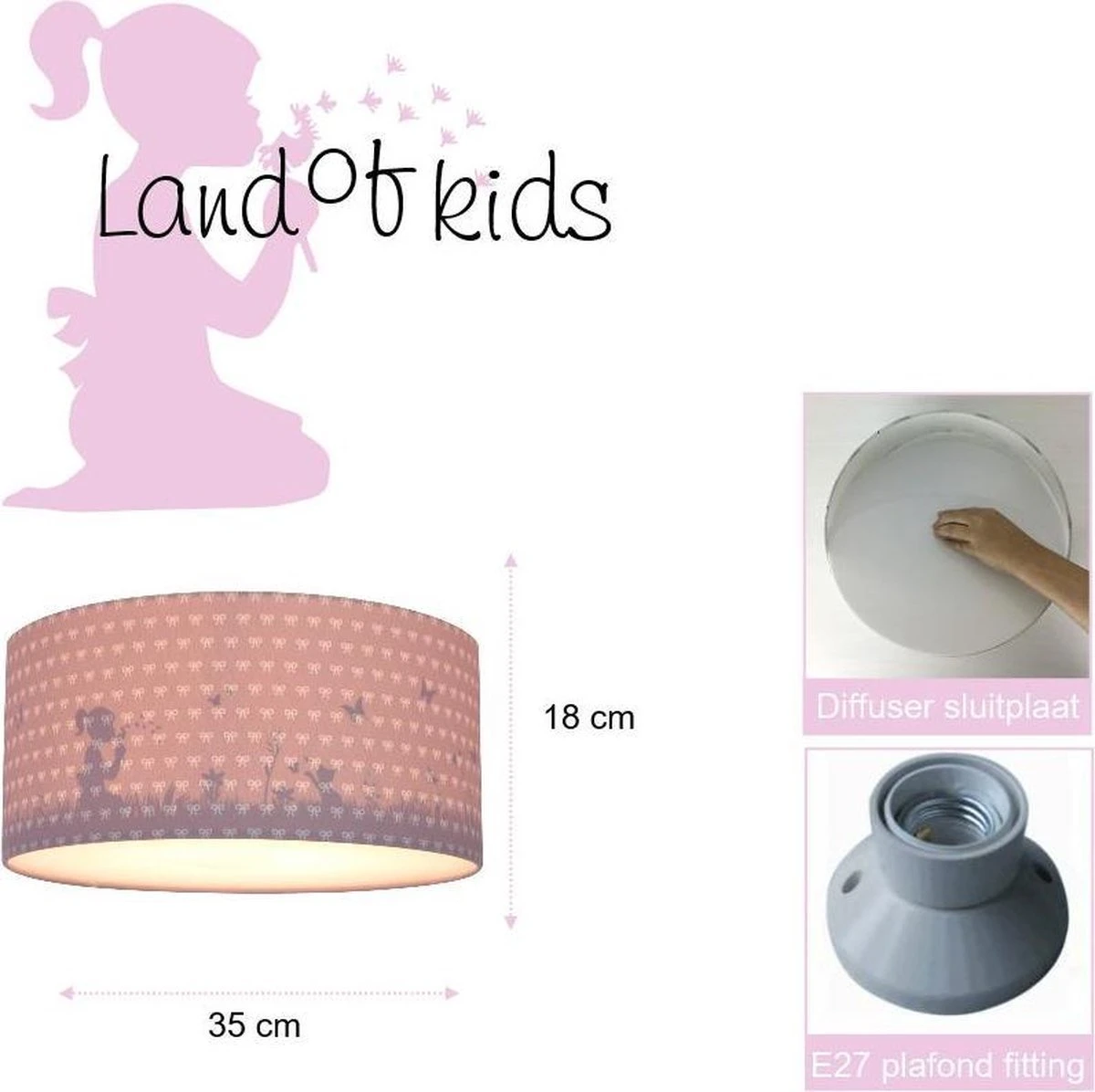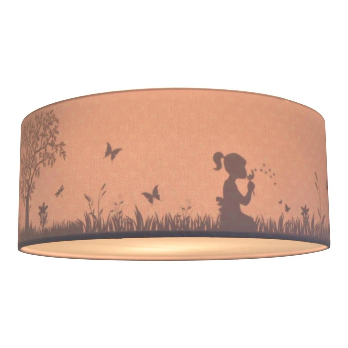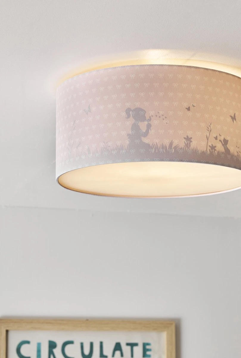 Lamp Babykamer Roze. Ben jij op zoek naar de Dandelion Roze plafondlamp? of Kinderkamer in roze. Mooie kinderplafondlamp in roze met prachtig silhouet schaduw effect. Staat de lamp uit? Je ziet een roze kinderlamp met kleine witte strikjes. Zet je de plafondlamp aan komt er een prachtig silhouet tevoorschijn uit de schaduw met een meisje in een lente veld. Het meisje blaast tegen paardenbloemen, een katje speelt met de vlinders die rond fladderen. Een prachtig verstopt tafereeltje in deze vlinder lamp.