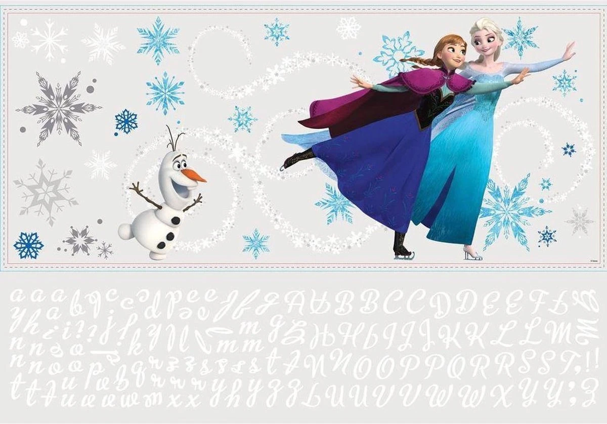Versier je muur met deze sprookjesachtige muurstickers van Frozen. In de doos vind je 2 vellen zelfklevende, voorgesneden muurstickers. De stickers zijn opnieuw te gebruiken zonder beschadiging van het oppervlak. De stickers zijn te gebruiken op geverfde muren, accessoires, meubels, tegels en glas. Voor het beste resultaat wordt aangeraden om de stickers niet te gebruiken op pas geverfde muren en muren die net zijn behangen. Deze muren dienen eerst minimaal drie weken te drogen. Op gevoelige oppervlakte of behang raden wij aan de stickers op een onopvallende plaats te testen. De set bestaat uit een grote muursticker met een afbeelding van Elsa, Anna en Olaf. Deze sticker heeft een afmeting van 81.3 x 41.9 cm. Op het kleine stickervel verschillende letters en tekens.