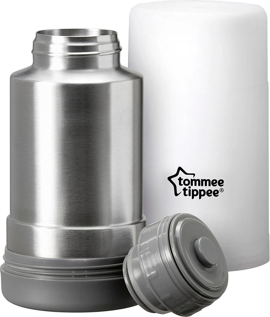 Niet verwonderlijk dat baby’s het liefst hun voeding op lichaamstemperatuur hebben, want dat is de temperatuur die voor hen het natuurlijkst aanvoelt. Met de Closer to Nature draagbare flessen- en voedselverwarmer voor op reis van Tommee Tippee kan je de voeding van je baby tot de perfecte temperatuur opwarmen, waar je ook bent. Je hebt geen externe warmtebron nodig, waardoor hij ideaal is voor op reis, zodat je altijd een even goede ouder blijft. De Closer to Nature flessen- en voedselverwarmer voor op reis heeft geen elektriciteit nodig en biedt een handige en probleemloze manier om zuigflessen en babyvoeding onderweg op te warmen. Je kan er moedermelk en flesvoeding mee opwarmen, maar ook voedsel uit potten of zakjes. Hij is voldoende compact om in de verzorgingstas te passen; dus voortaan kan je je baby overal en altijd voeden. De roestvrijstalen, thermisch geïsoleerde fles is perfect om heet water in te doen en het ook heet te houden tot het tijd is voor de volgende voeding van je baby. Ze wordt dichtgemaakt met een stevig deksel dat voorkomt dat er heet water in je tas lekt en dat gemaakt is van BPA- en ftalaatvrije materialen. De flessen- en voedselverwarmer voor op reis is gebruiksvriendelijk, je volgt gewoon deze eenvoudige stappen: 1. Vul de geïsoleerde, roestvrijstalen fles met heet water en draai het deksel stevig vast 2. Zodra het tijd is om de voeding van je baby op te warmen, giet je het water uit de thermosfles in het geopende deksel 3. Plaats de fles van je baby of het voedingspotje in het hete water om op te warmen 4. Zodra de fles of de voedselhouder warm is, haal je ze uit en test je de temperatuur alvorens je baby te voeden De flessen- en voedselverwarmer voor op reis werd speciaal ontworpen voor alle Tommee Tippee Closer to Nature-zuigflessen, maar ook voor verschillende voedingspotten en -zakjes van tal van andere merken. De verpakking omvat: 1 x Tommee Tippee Closer to Nature draagbare flessen- en voedselverwarmer voor op reis.