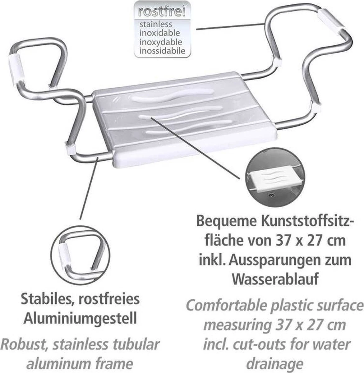 Het Wenko badzitje hangt eenvoudig aan de rand van de badkuip en heeft een draagvermogen tot 150kg, door de aanpasbare breedte past het zitje op alle gangbare baden.