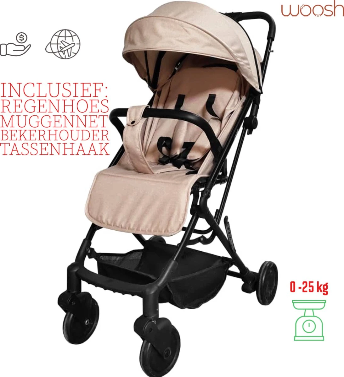 WOOSH New Buggy – Sand / Black – One Hand Folding – 3 Slaapstanden – Wandelwagen Tot 25 Kg – Regenhoes – Bekerhouder – Muggennet