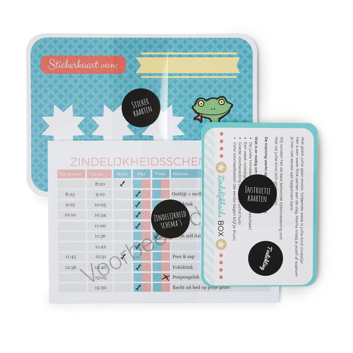 Het trainingsprogrammaboekje bevat instructies en veelgestelde vragen met antwoorden. De instructiekaarten geven je beknopte instructies per dag als herinnering. De complimentkaarten gebruik je als je even door je complimentjes heen bent. En met de zindelijkheidschema’s leer je de momenten kennen waarop jouw kind naar het toilet moet, zodat je de succeskans vergroot. Doe enthousiast en beloon je kind! Met stickerkaarten variërend van drie tot negen vakjes weet je wanneer, en kun je de beloningsfrequentie verlagen op het moment dat jouw kind daaraan toe is. Natuurlijk bevat de box ook vrolijke dierenstickers om te plakken, wanneer je kind een succeservaring heeft.